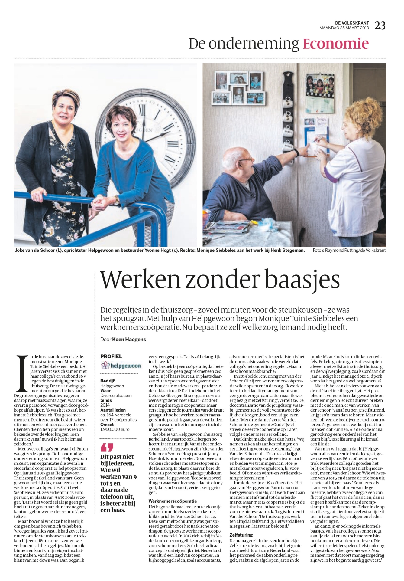 Met twee collega’s en twaalf cliënten waagt ze de sprong. De broodnodige ondersteuning komt van Helpgewoon in Zeist, een organisatie die overal in Nederland coöperaties helpt opzetten. Op 1 januari 2017 gaat Helpgewoon Thuiszorg Berkelland van start. Geen gewoon bedrijf dus, maar een echte werknemerscoöperatie. Spijt heeft Siebbeles niet. Ze verdient nu 13 euro per uur, in plaats van 9 à 10 zoals vroeger. ‘Dat is het voordeel als je geen geld hoeft uit te geven aan dure managers, kantoorgebouwen en leaseauto’s’, vertelt ze.